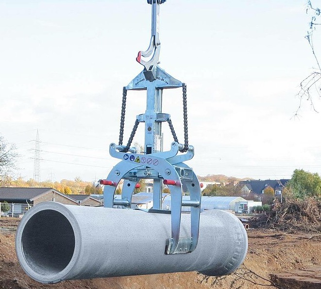 The Probst Round Grab RG20/85 SAFELOCK for lifting, transporting, and laying concrete pipes on construction sites. SAFELOCK design - The clamping force of the claws is maintained fully in all cases, even if the carrier is operated incorrectly.