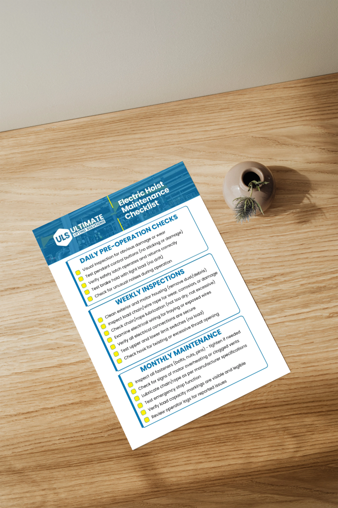 At ULS Lifting, we don't just sell electric hoists - we help you keep them running at their best. Whether you need advice on your hoist maintenance checklist, help selecting the right equipment for your application, or a replacement for an ageing unit, our specialists are ready to assist.